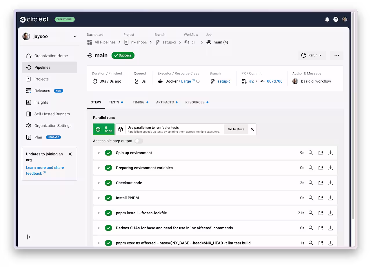 Nx Cloud will create a comment on your PR that gives you a summary of the CI run and a link to dig into logs and understand everything that happened during the CI run.